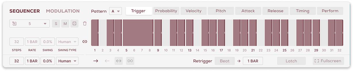 Track Trigger, Velocity, Probability, Attack, Release, Timing and Perform