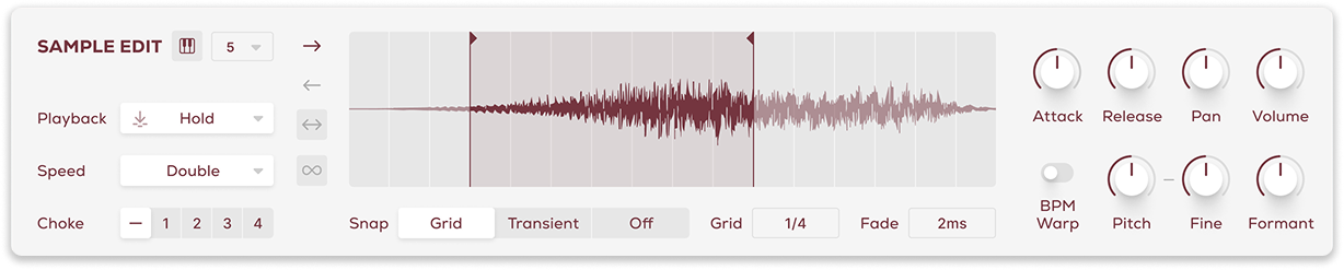 For those who want to go deeper, programming entire sequences, chopping up hits and loops and using custom samples, it’s all unearthed in the Edit page. Bloom Drum Kits’ Edit Page houses parameters like playback type and direction, attack and release, pitch and panning and everything else you’d expect in a modern sampler.