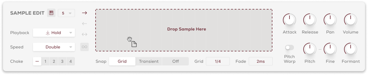 Adding your own samples to use as sources in Bloom Drum Kits is perfect for those who want to put their personal stamp on the Bloom engine. Drag and drop an audio file onto the sample display in the Main Page to replace the existing sample.