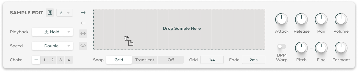 The Edit page is the central hub for refining and making the library of samples your own. Adjust start and end points, manipulate playback speed and direction, and tweak the timbre with pitch and formant controls.