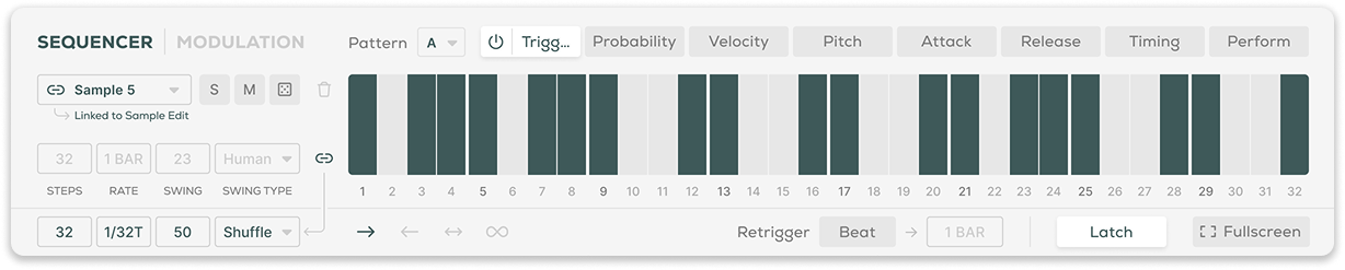 Global / Track Step Rate, Sync, Swing, Steps, Latch, Beat Retrigger controls