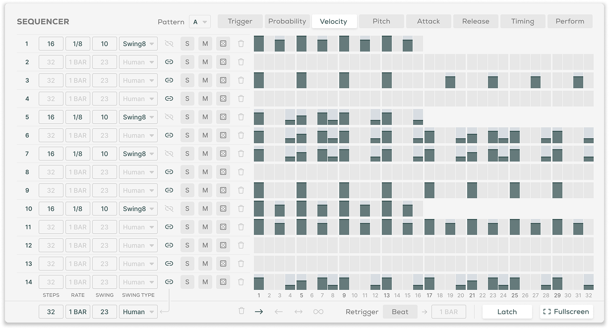 Track Trigger, Velocity, Probability, Attack, Release, Timing and Perform