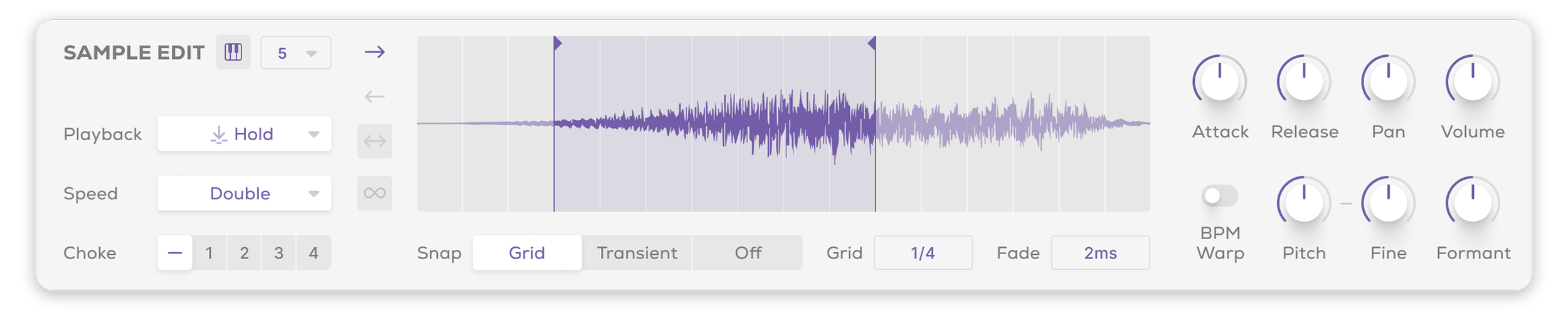 In the Sample Edit section, modify the 14 source samples in each bank. Set sample start and end points, and adjust trigger types, playback direction and speed. Refine pitch, formant settings, and the envelope's attack and release, alongside setting up choke groups for dynamic vocal interactions.