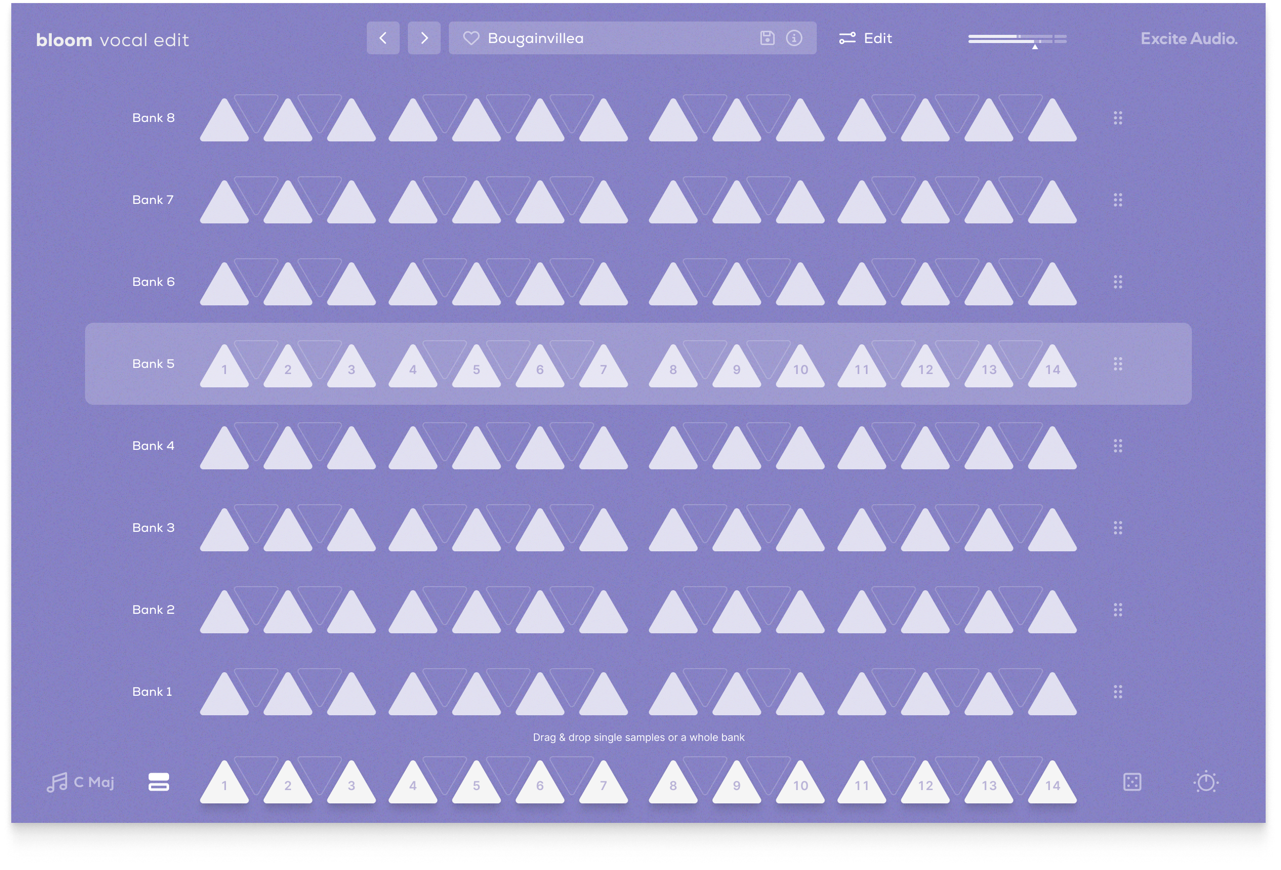 With eight banks of sounds, each dedicated to a different type of vocal style, Bloom Vocal Edit provides a versatile foundation for any project. Trigger a sample with a MIDI white note to add vocals to your track instantly, or utilise the Phrase Player to weave the sample into a complex vocal sequence.