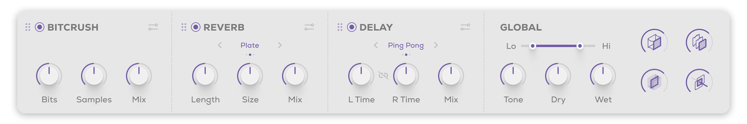 3 Rearrangable Effects: Bitcrush, Reverb, Delay