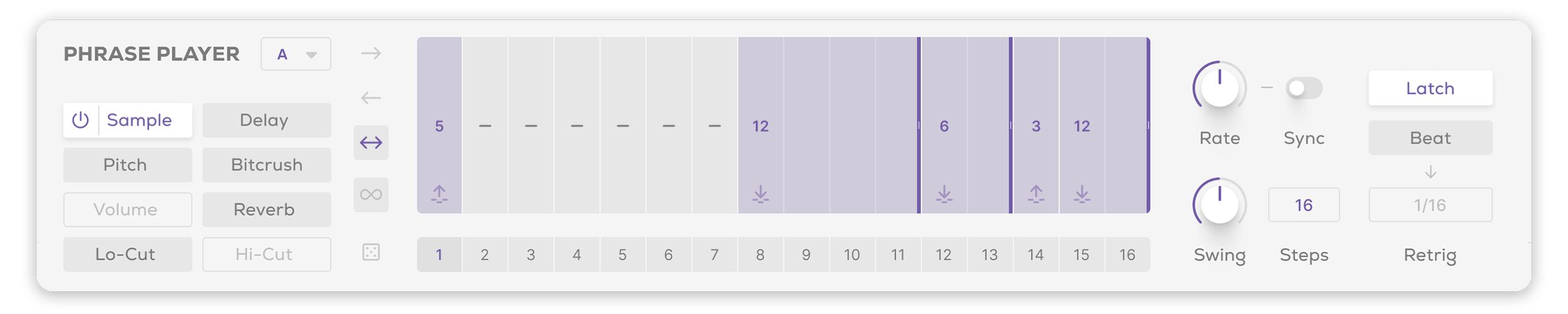 Phrase Rate, Sync, Swing, Steps, Latch, Beat Retrigger controls