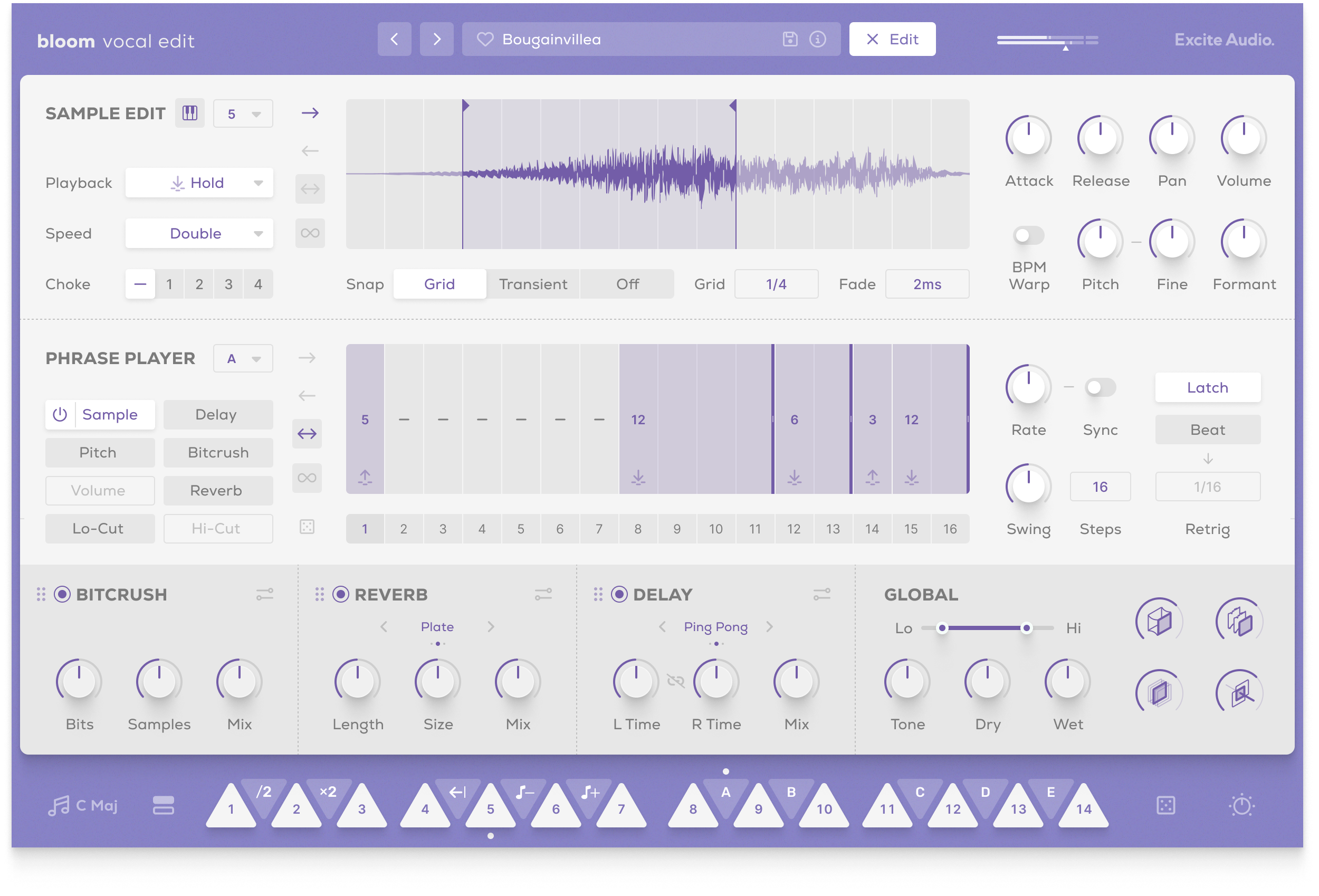 Choose your key signature, select a bank of samples or a preset, and trigger one of 14 bpm-synced phrases spread across 2 octaves. White keys initiate vocal samples and loops, while black keys adjust characteristics such as playback speed and pitch, besides triggering bespoke sequences and effect modulation.