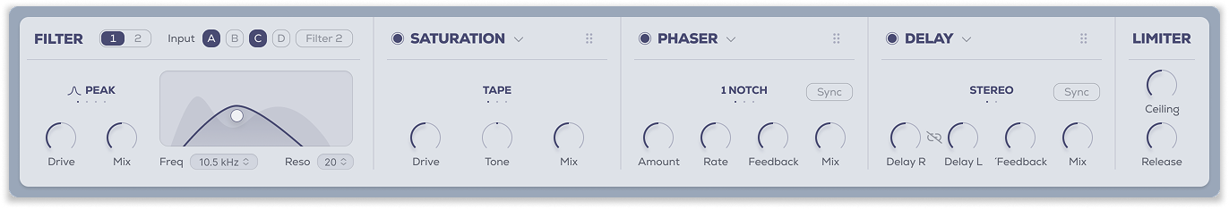 Dual filters allow the each source (A, B, C, D) to easily be routed as inputs, and can be run in parallel or series by feeding one filter into the other. Both filters have a variety of filter curves, Cutoff and Resonance controls, filter Drive and Mix.
