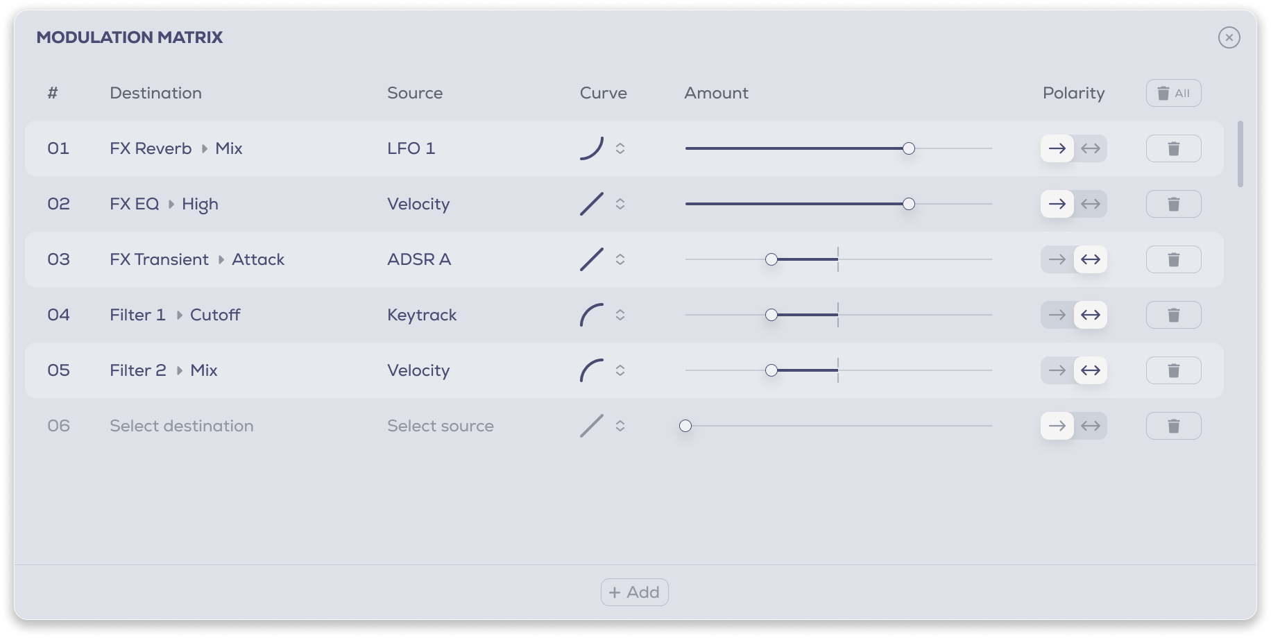 A full modulation matrix awaits advanced sound designers, showing all the assigned modulation routings as a manageable list. Parameters such as modulation curve and polarity allow even deeper customisation.