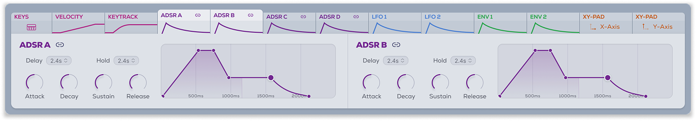 ADSR (A/B/C/D) Parameters: Delay, Attack, Hold, Decay, Sustain, Release, Link