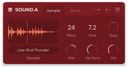 Sampled sources give you play direction, tone and keytracking parameters to play with, while synth sources get an oscillator shape slider and unison detuning. Control the Pitch and Fine tuning, plus Velocity Sensitivity, Panning and Volume for any sound.