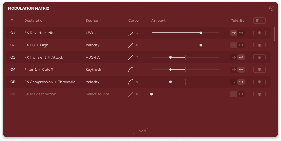 A full modulation matrix awaits advanced sound designers, showing all the assigned modulation routings as a manageable list. Parameters such as modulation curve and polarity allow even deeper customisation.