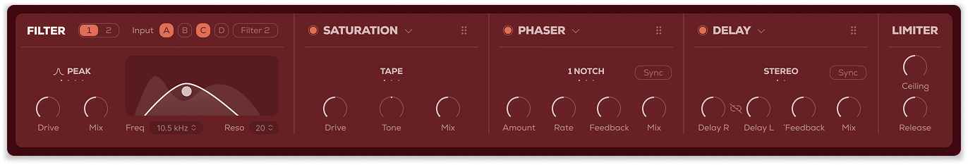 Dual filters allow each source (A, B, C, D) to easily be routed as inputs, and can be run in parallel or series by feeding one filter into the other. Both filters have a variety of filter curves, Cutoff and Resonance controls, filter Drive and Mix.