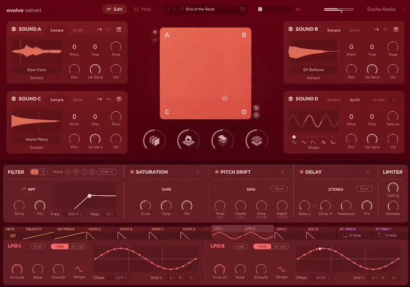 Blend your sound from four layers, morph between them with the XY pad, and then shape the output using four velvet inspired macro effects: Soften, Warmth, Sway and Haze. Evolve Velvet offers dual filters, endless modulation potential and 16 effects modules to power its 250 presets crafted by Excite Audio’s team of professional sound designers.