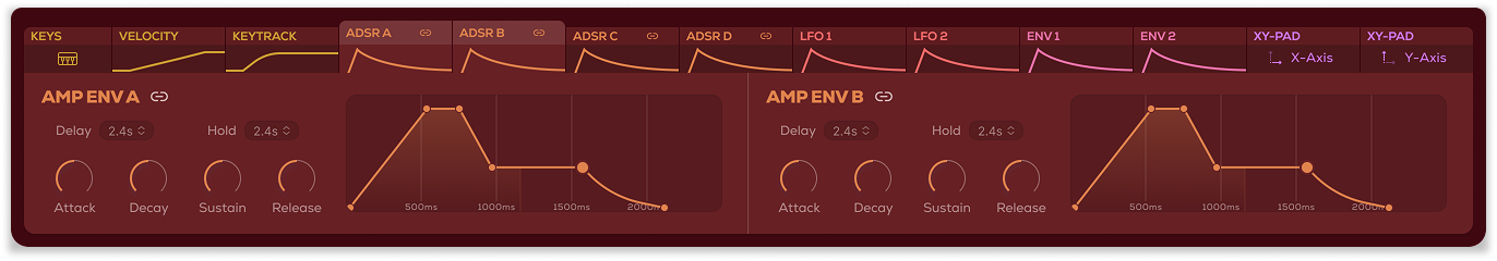 ADSR (A/B/C/D) Parameters: Delay, Attack, Hold, Decay, Sustain, Release, Link