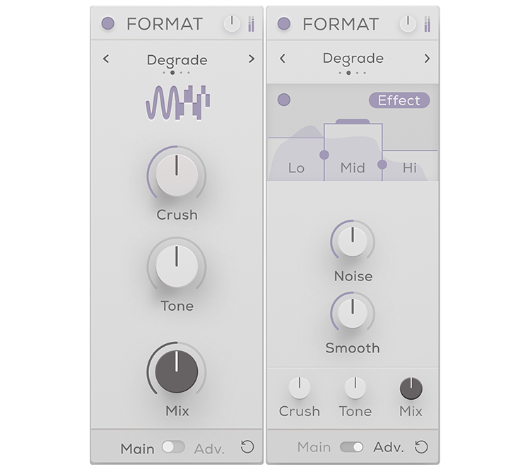 Every element of Format brings a distinct flavour. Degrade and Resample reduce the bit-depth and sample rate to collide two contrasting directions of digital distortion.