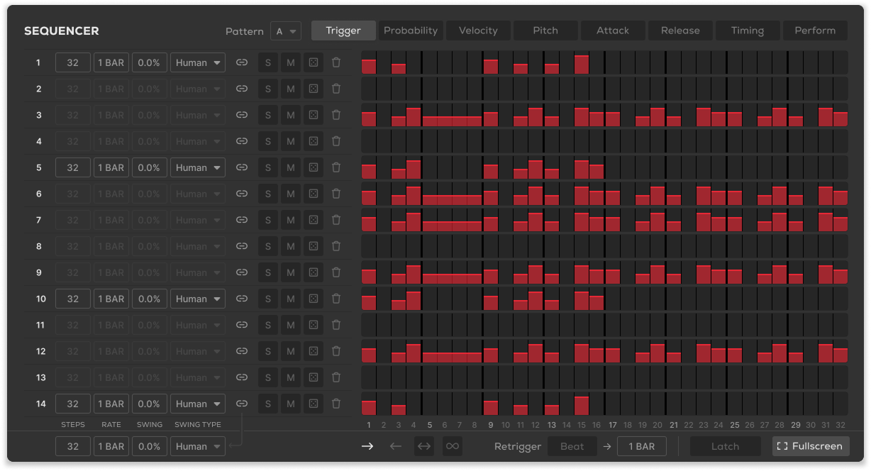 Track Trigger, Velocity, Probability, Attack, Release, Timing and Perform