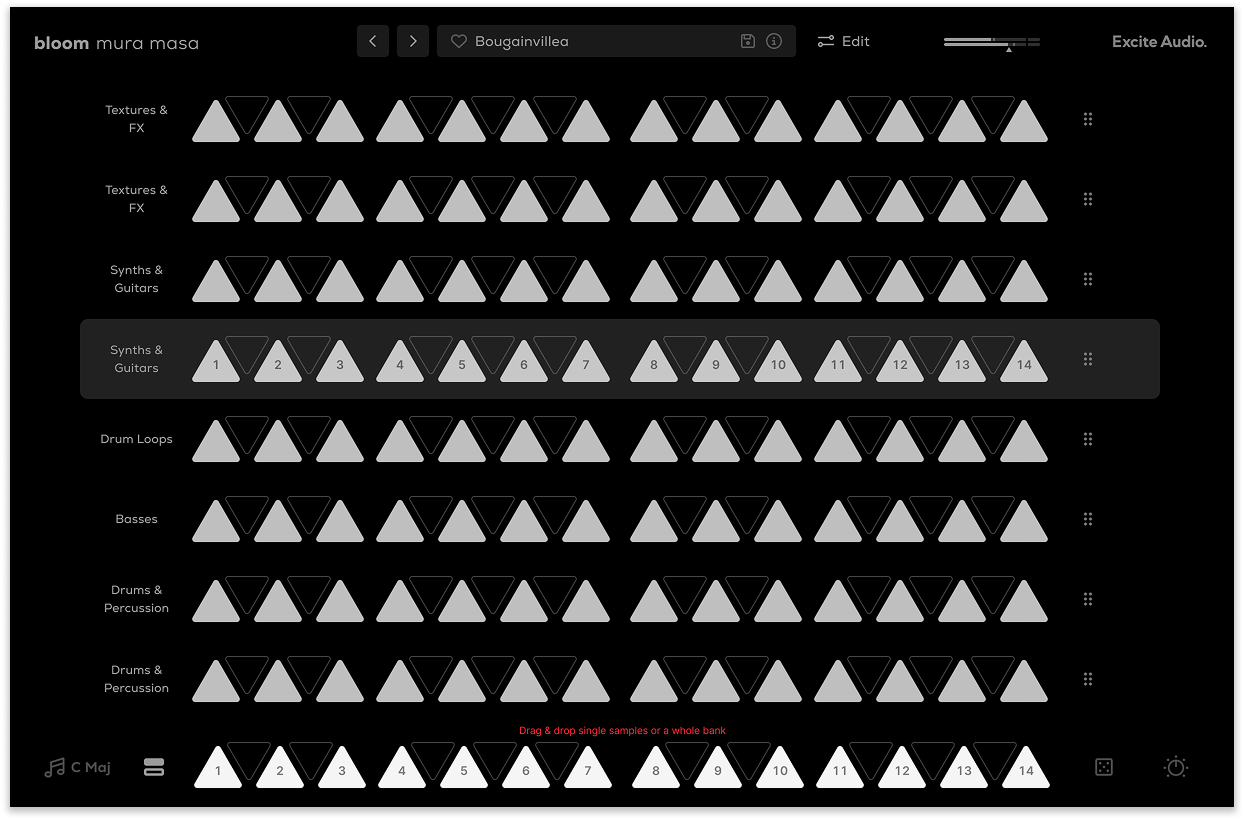 There are eight banks of sounds to choose from, organised into easy-to-find categories. Swap sounds by loading a new bank or dragging individual samples onto the 14 white notes for instant variation.